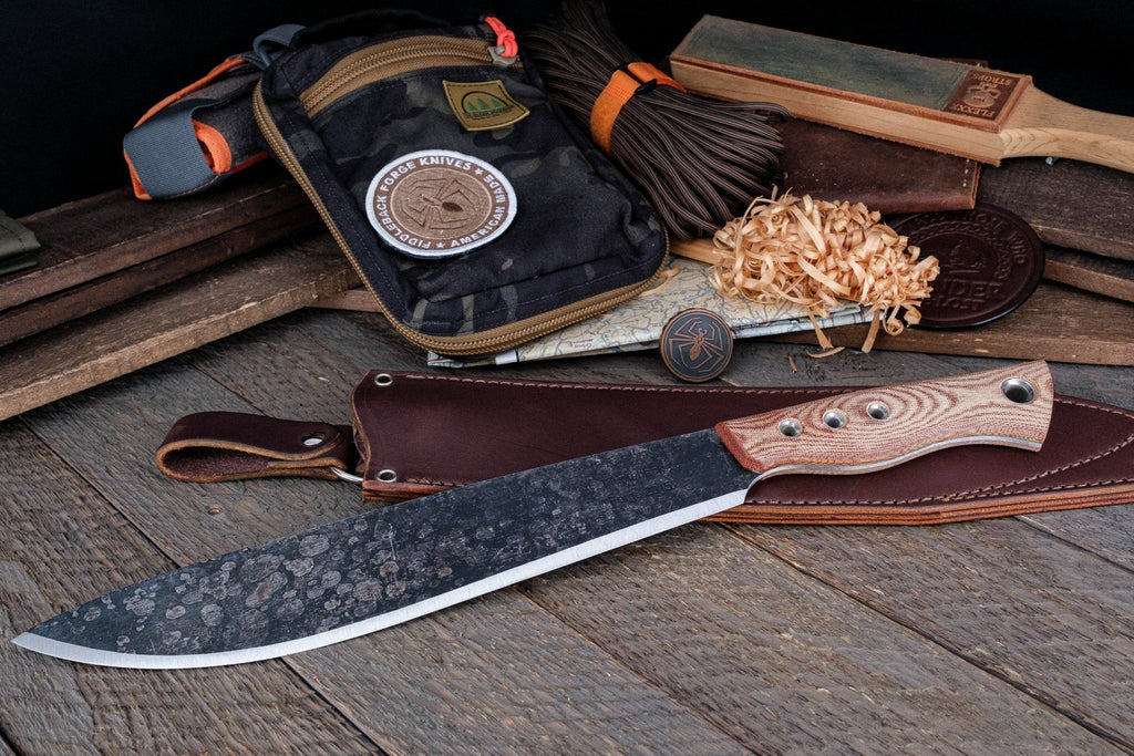 Models include: Fiddleback Forge Low Country (x2), Gullet, Lonestar EDC, Snowbill, Petit Oiseau, and BUSHBOOT (x4).
