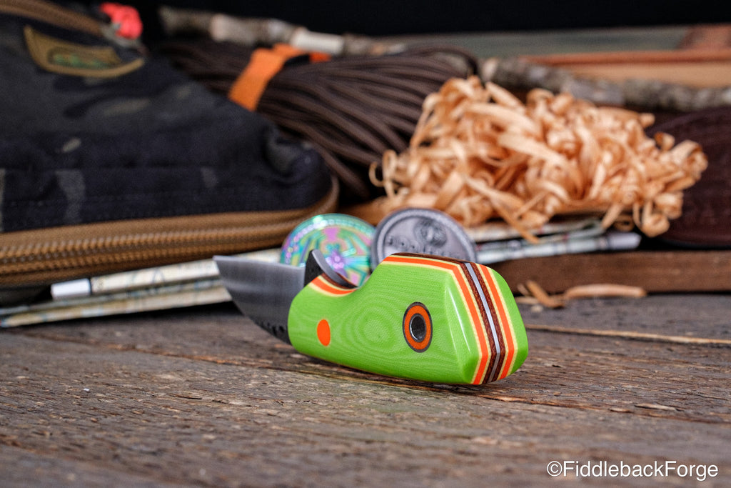 Handle Material: Electric Green Linen Micarta - Natural Liners - Orange and Yellow Stripes