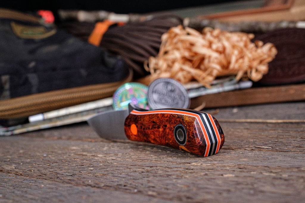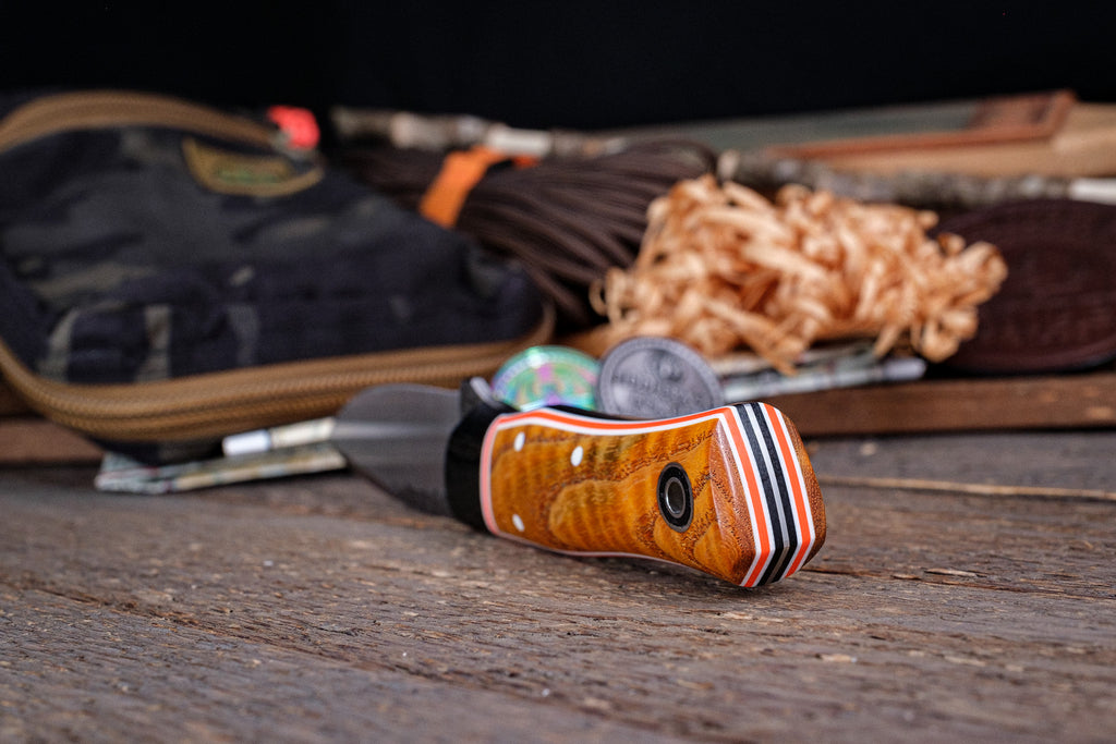 Handle Material: Spalted Maple Burl - Black Liners - Orange and White Stripes