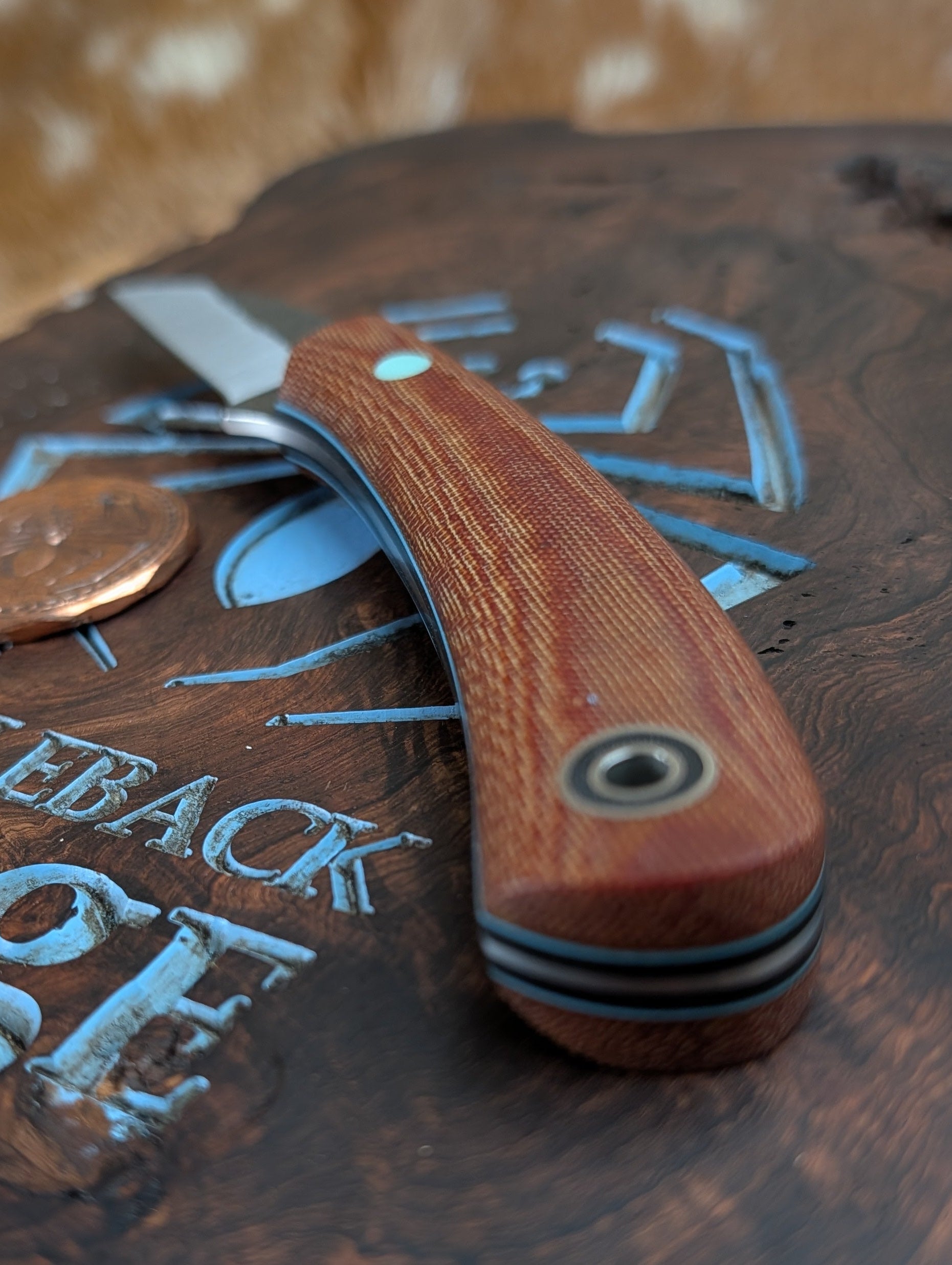 Fiddleback Forge Woodpecker Knife - Natural Canvas Micarta - Black Micarta Liners - Tiffany Blue G10 Pinstripes