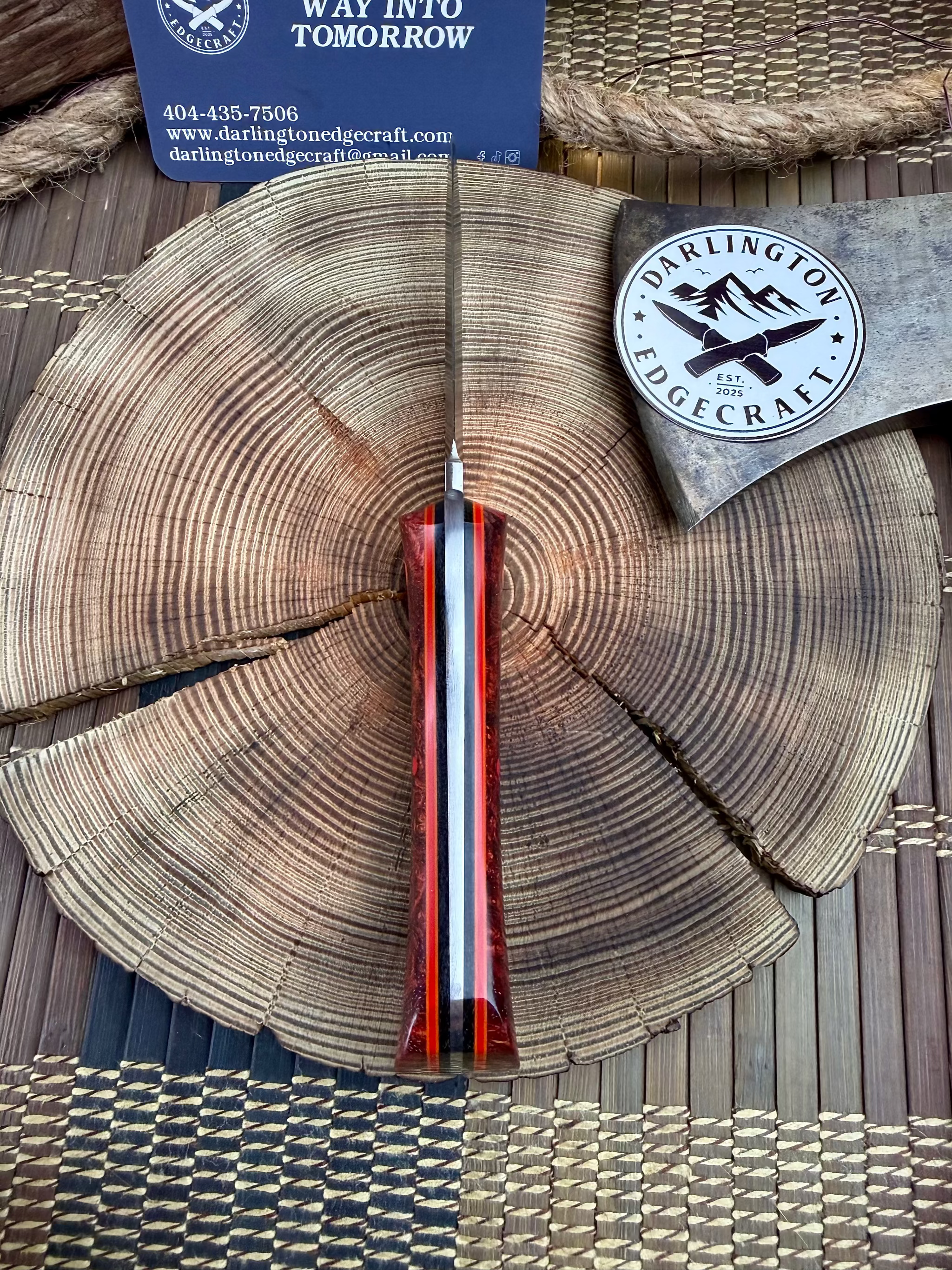 The maker at Darlington Edgecraft, Carley Perkins, is the newest apprentice at Fiddleback Forge, and yet, her knives look like she's been making for years!! This is a really cool EDC style knife. The design is great and it feels excellent in the hand too. Its got a sexy swedge and makes the point very efficiently. Its super light and quick. Outstanding work here.