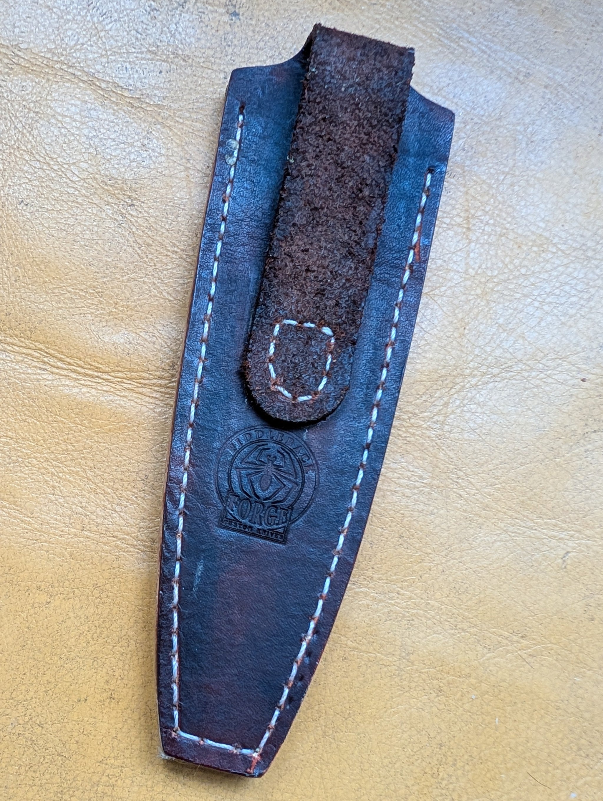 This sheath fits the Hiking Buddy size knives in the Fiddleback Forge Lineup.  These knives have a 3.5" blade and 4" handle.  Several models fall into this exact form factor.