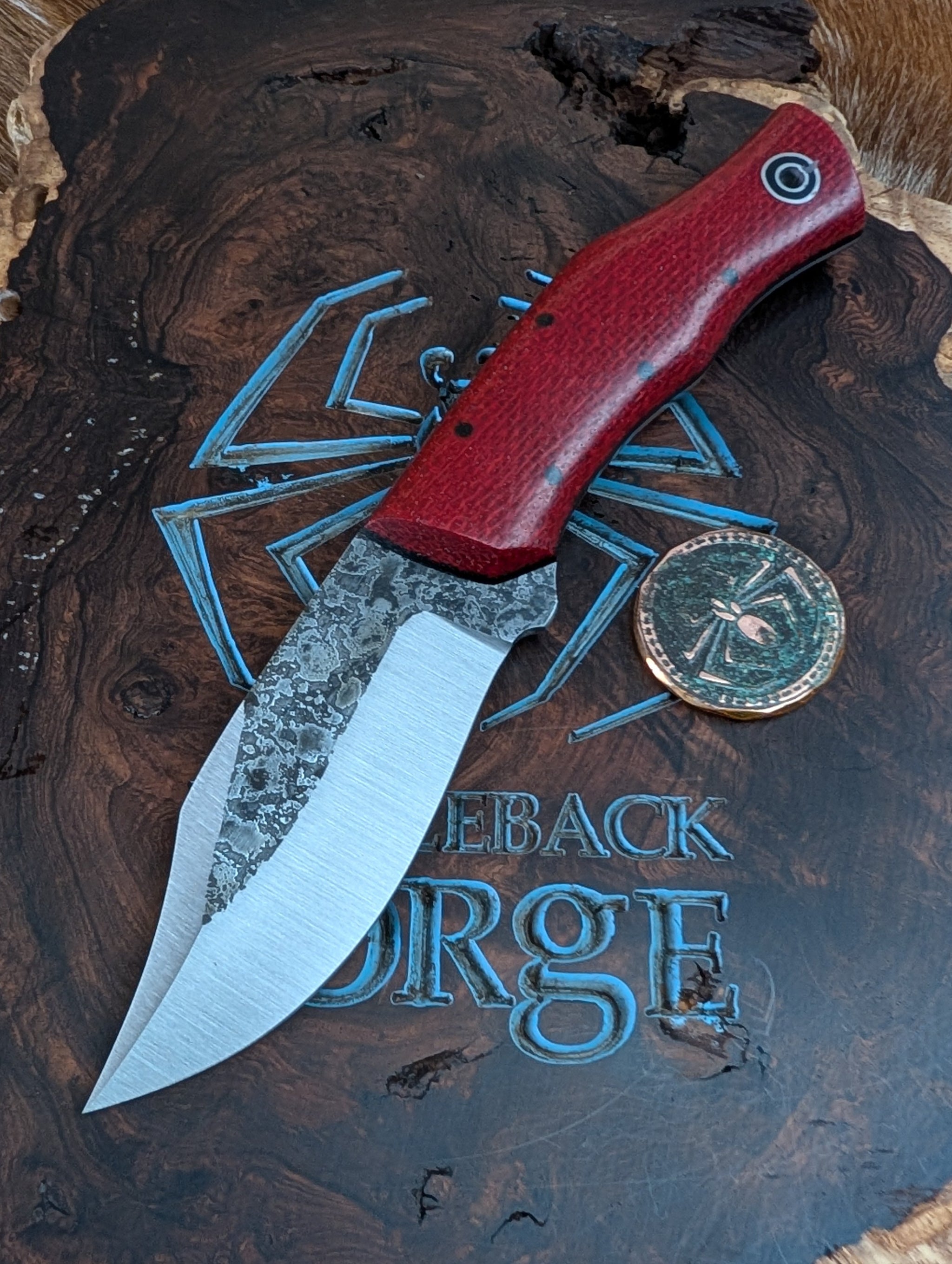 Fiddleback Forge Bullfrog Bowie Knife -Ruby Red Burlap from Shadetree - Black Micarta Liners