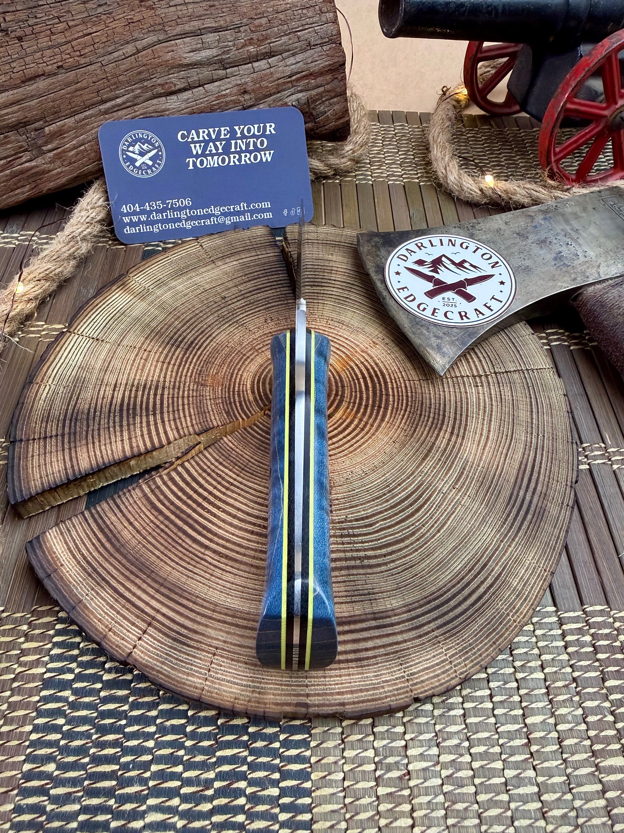 The maker at Darlington Edgecraft, Carley Perkins, is the newest apprentice at Fiddleback Forge, and yet, her knives look like she's been making for years!! This is a really cool EDC style knife. The design is great and it feels excellent in the hand too. Its got a sexy swedge and makes the point very efficiently. Its super light and quick. Outstanding work here.