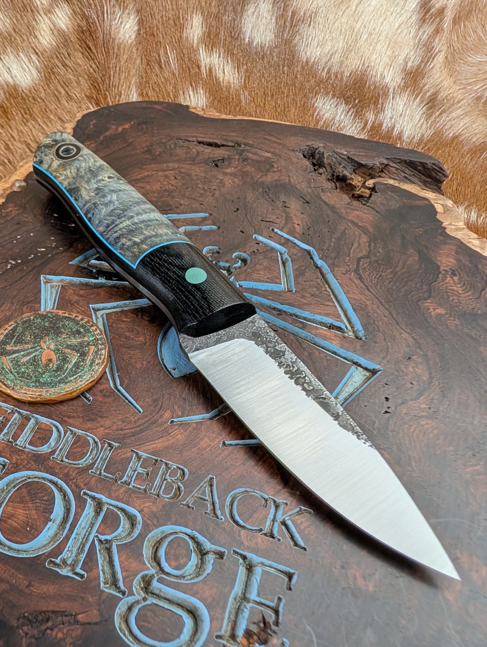 Handle Material: Beautiful Bolstered Blue Curly Maple - Black Micarta Bolsters and Liners - Blue G10 Pinstripes
